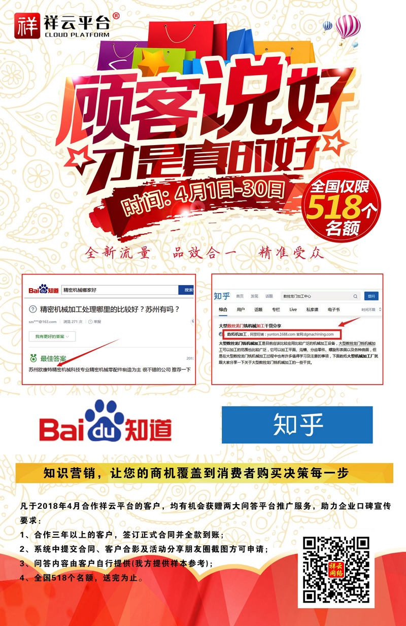 百度知道,知乎。全新流量,品效合一,精準受眾。現在做祥云營銷型網站,就送百度知道、知乎口碑營銷! 截止日期:2018-4-28日